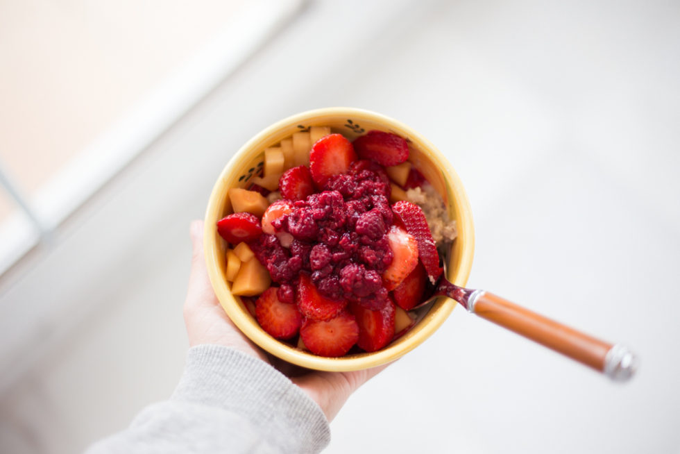 ... sain nauttia mamman valmiiksi haudutetusta luomukaurapuurosta vadelmilla sekä papaijalla.